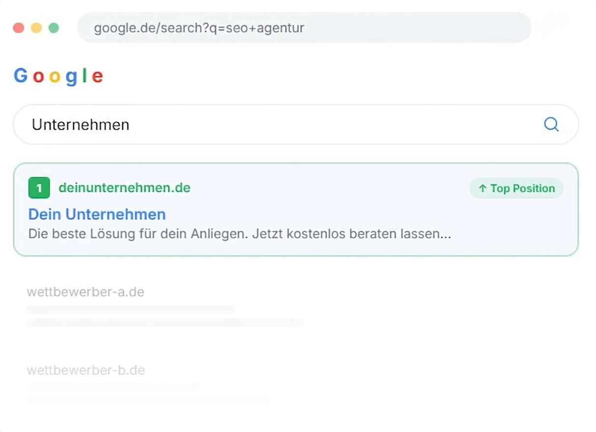 Google ist heute der erste Ort, an dem Menschen nach Dienstleistungen, Produkten oder Lösungen suchen. Wenn dein Unternehmen dort nicht erscheint, entscheiden sich potenzielle Kunden meist für andere Anbieter. Mit gezielter Google SEO Optimierung sorgen wir dafür, dass deine Website genau dann sichtbar wird, wenn nach deinem Angebot gesucht wird.